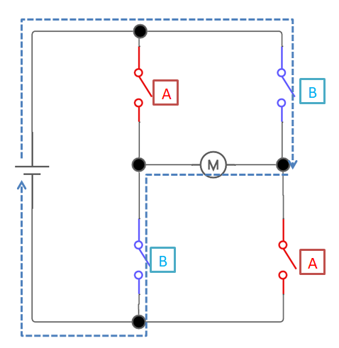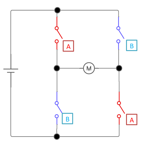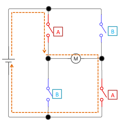 モータ(負荷)に対してスイッチが4つ繋がっていて、『A』『B』と描いてあります