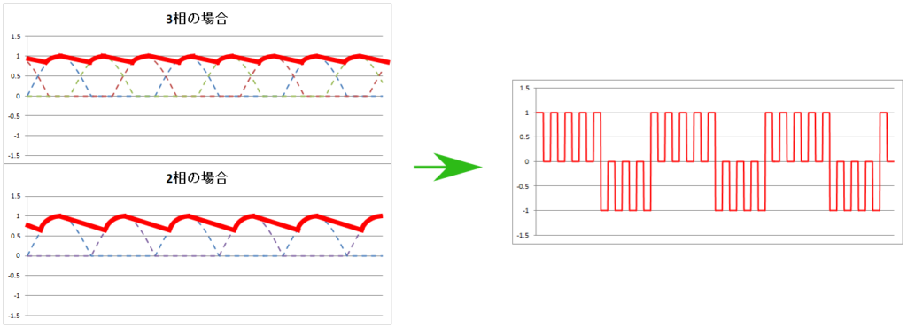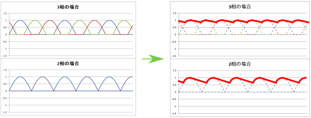 ちなみに、単相(1相)の場合は山ができて、しばらく「0」になって、また山ができて…を繰り返します