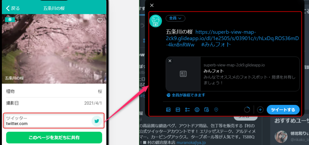 でその中に、Twitterに共有する機能をつけました