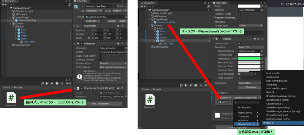 このページの中程で、ボタンのOn Clickにスクリプトを割り当ててWalk()、Back()メソッドをそれぞれ設定する、という内容がありますが上手くできません